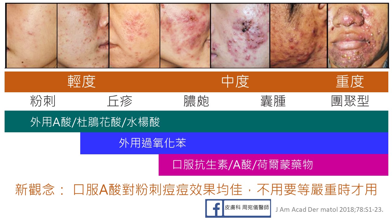 而目前最新的觀念認為,口服A酸對痘痘粉刺的效果都很好,可以早期低劑量使用,不需要等到嚴重時才使用,以免產生痘疤。